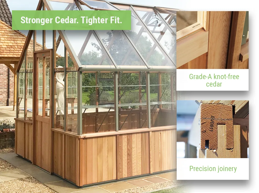 The Alton Cheltenham is for someone who wants the classic look of a cedar greenhouse—bright, tall, and unmistakably traditional. Its half-boarded cedar design gives it that timeless greenhouse character, while the steep 45° roofline creates a more open, airy feel inside.