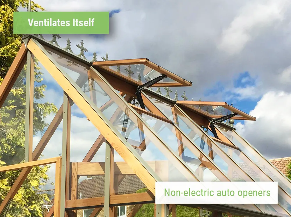 The Cheltenham includes roof vents with automatic wax openers, so they begin opening as temperatures rise—without electricity and without constant adjustment.