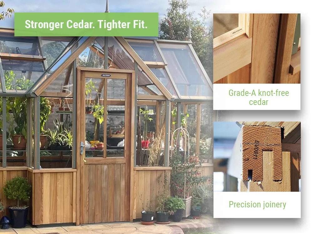 Alton uses 100% Western Red Cedar, which is naturally rot-resistant and well-suited to greenhouse conditions.