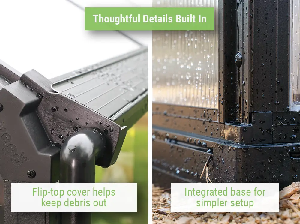 Some of the Pacific’s best features show up in daily use. The wide Dutch double door with a low threshold makes it easier to move tools, trays, and harvests in and out, while the flip-top gutter cover helps keep leaves and debris out so the rainwater collection system stays cleaner with less upkeep.