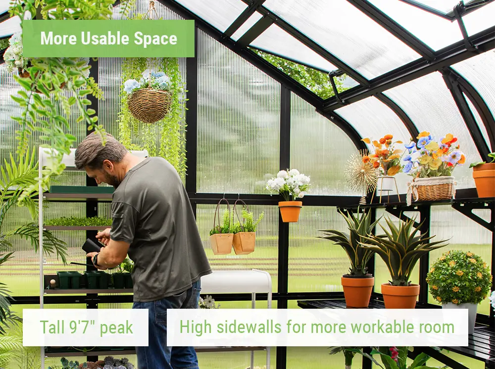 - Roomier, more usable interior: tall peak and higher sidewalls create more workable growing space