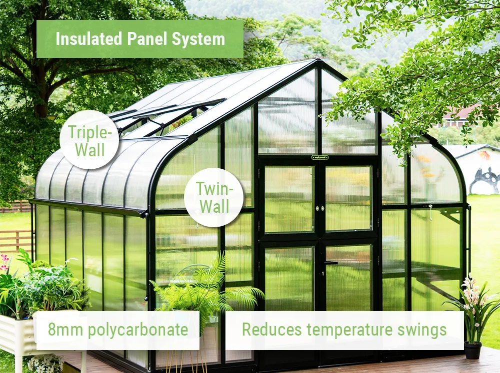 - Insulated polycarbonate glazing: Triple-wall roof and twin-wall side panels help hold steadier temperatures.